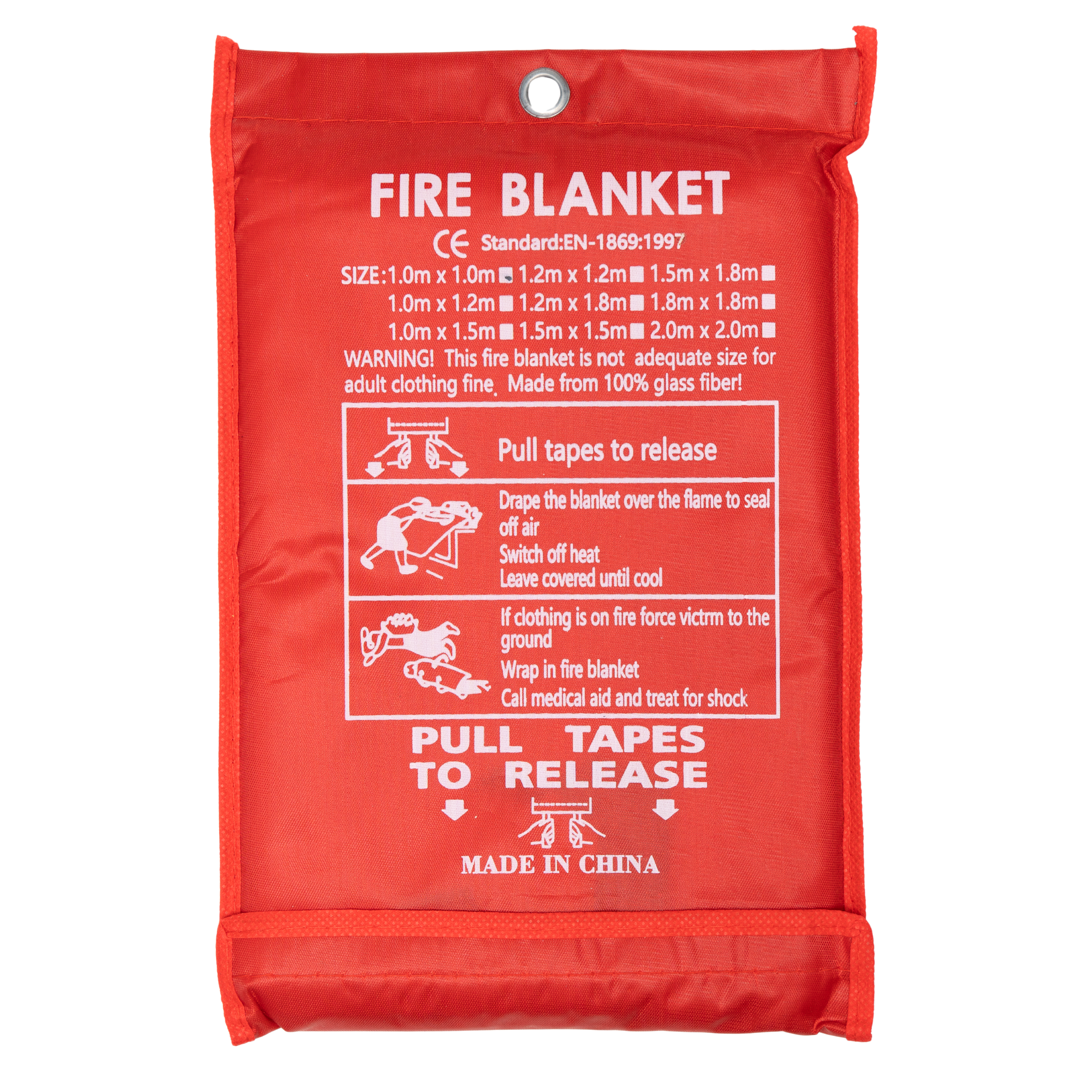 Es muy fácil de usar: basta con tirar de las cintas para desplegarla y colocarla sobre el fuego o envolver a una persona en caso de emergencia. Su funda roja con instrucciones impresas permite un acceso rápido e intuitivo en situaciones críticas.